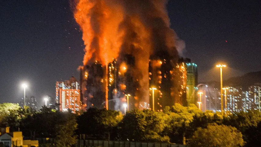 An mehreren Gebäuden waren Bambusgerüste für Renovierungsarbeiten angebracht. Berichte zeigten Fassadengerüste, brennende Bauteile stürzten zu Boden und in einzelnen Wohnungen seien Brandherde zu erkennen.